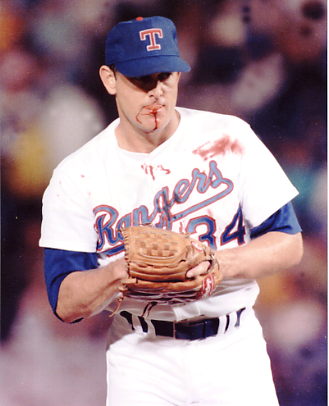 September 8, 1990. In the 2nd inning, Nolan took a ball to the face hit by Bo Jackson. He refused to leave the game and stayed in to pitch to the 7th inning.