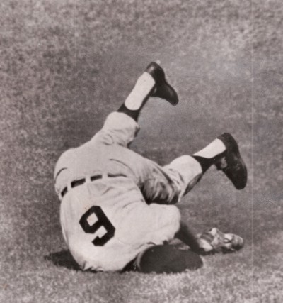 Al Kaline of the Tigers breaking his collarbone with a game saving catch on May 26, 1962.