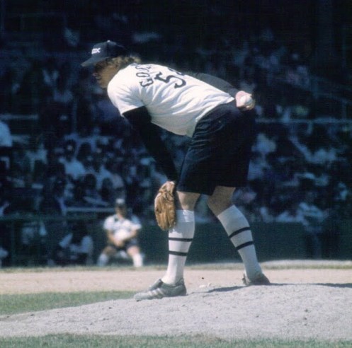 August 8th, 1976. Rich “Goose” Gossage of the Chicago White Sox wears the infamous White Sox “Shorts Uniform” which also included a shirt with a collar.