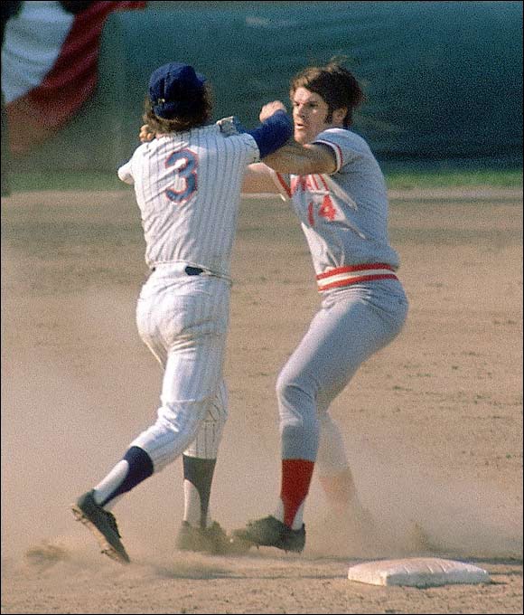 Bud Harrelson of the Mets and Pete Rose of the Reds fight at 2nd base during Game 3 of the 1973 NLCS.