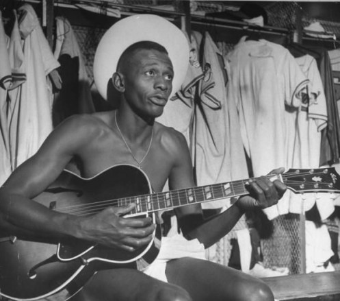 Satchel Paige playing guitar in the Cleveland Indians clubhouse sometime during the 1948 or 1949 season.