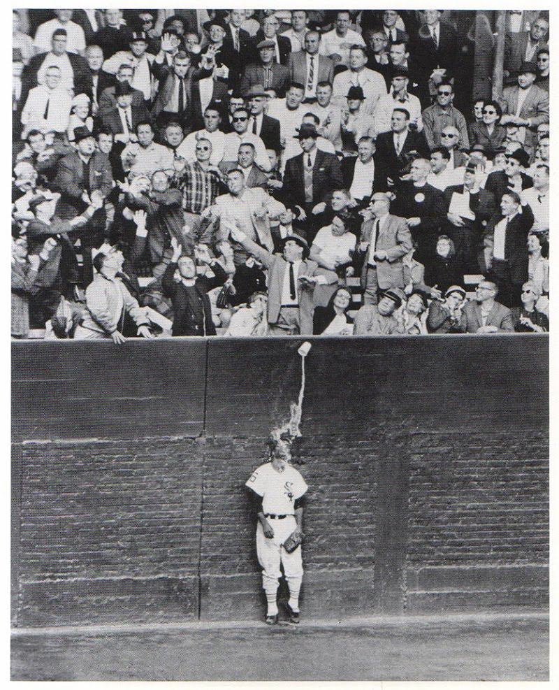 Al Smith of the Chicago White Sox gets beer spilled on him while he watches Charlie Neals of the Dodgers home run leave the park during the 1959 World Series.