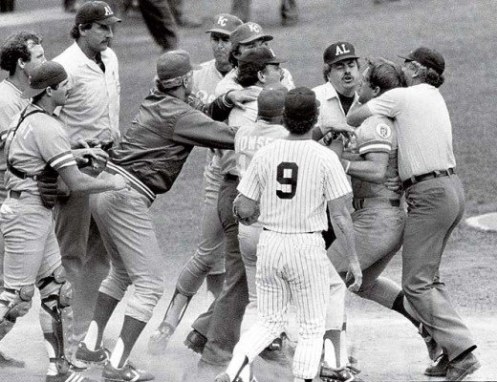 The Pine Tar Incident. George Brett being restrained during a Royals and Yankees game on July 24th, 1983.