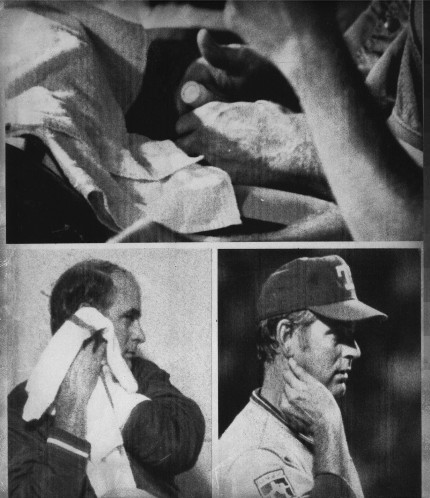Aug.31, 1977 as a Texas Ranger. Perry holds a tube, top photo, while sitting on the bench between innings during a game against the Royals. Bottom left photo, Perry’s left hand hidden under a towel goes to the right side of his neck. Bottom right photo, Perry’s pitching hand touches the right side of his neck. Perry won the game with a final score of 8-2.