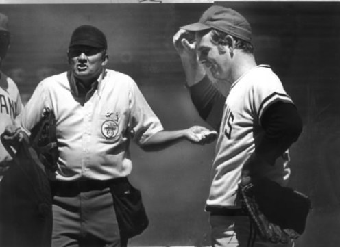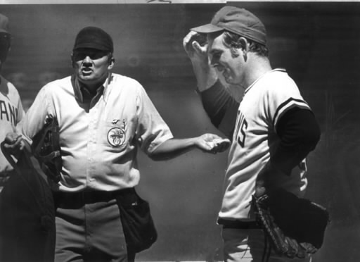 1972 as a Cleveland Indian. Gaylord Perry deals with umpire Bill Kunkel after being searched for foreign substances.
