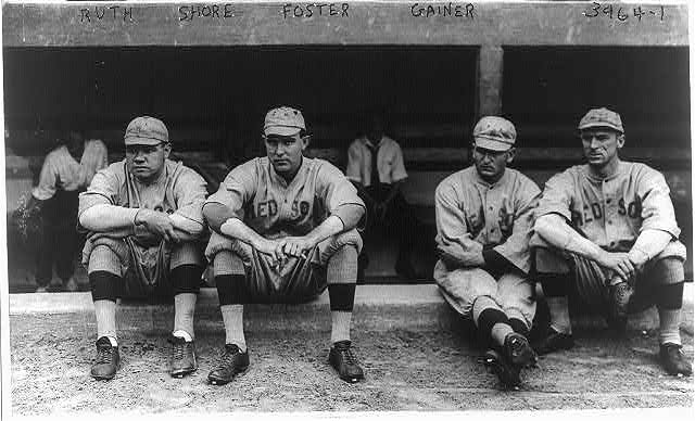 Members of the 1914 Boston Redsox. From L to R: Babe Ruth (pitcher), Ernie Shore (pitcher), George “Rube” Foster (pitcher), and Del “The Sheriff” Gainer (first base).