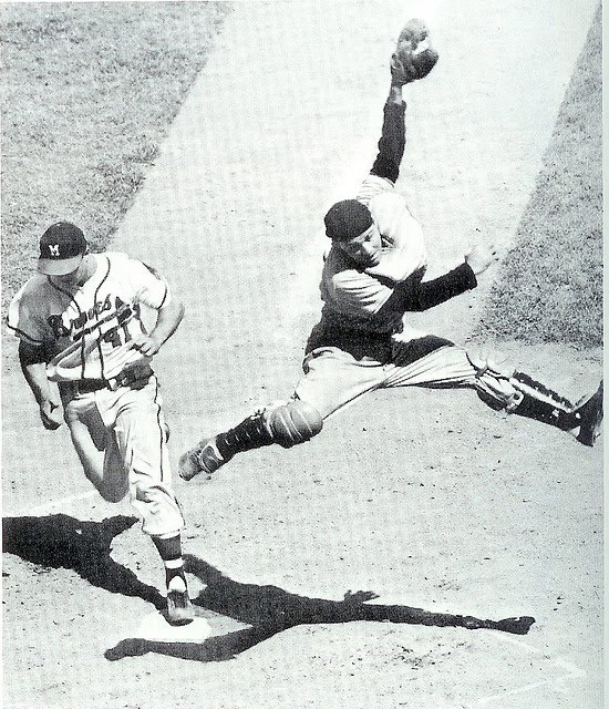 Eddie Mathews running across the plate while catcher Joe Garagiola is in mid-air.