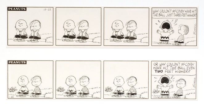 On December 22, 1962 Charles Schulz depicted his frustration with the San Francisco Giants losing to the New York Yankees in the 1962 World Series. In the bottom of the 9th inning of Game 7 of the World Series Willie McCovey hit a line drive directly to 2nd basemen Bobby Richardson to end the game. McCovey often went on record on saying it was the hardest ball he ever hit in his career. On January 28, 1963 Charles Schulz ran the identical comic strip altering the “three feet higher” line to “TWO feet higher.”