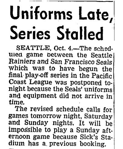 A October 5th, 1945 article in the LA times regarding a game between the Seattle Rainers and the Seals.