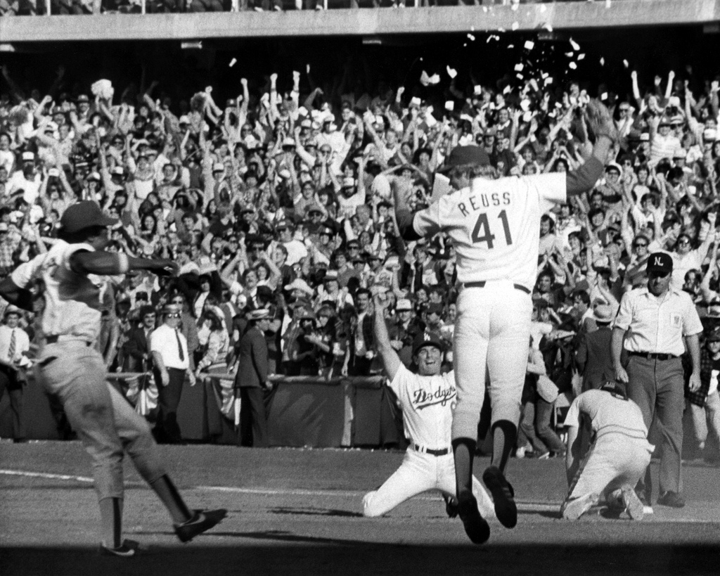 October 11th, 1981, Game 5 of the NLDS which the Dodgers faced the Astros at Dodger Stadium. I love this photo so much. The crowd going insane, Jerry Reuss jumping off the mound in childlike enthusiasm, Steve Garvey dropping to his knees with fists in the air, and the defeated Astro Dave Roberts on the ground at 1B after making the final out. The Dodgers went on to defeat the Expos in the NLCS and then the Yankees in the World Series.