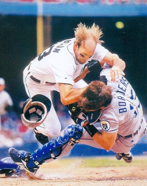 July 9th, 1995. Here we have Detroit Tigers slugger Kirk Gibson absolutely destroying Pat Borders of the Royals while scoring at home plate. The Tigers won the game 4 to 2 but I am going to go out on a limb and guess that Gibson ruined Borders’s day more so than the actual Royals losing. Everything is perfect about this photo. (UPDATE: Thanks to Nate Skinner for finding me a better version of this without the SI logo!)