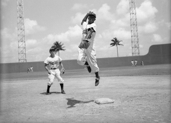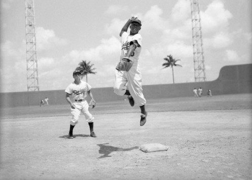 March 26th, 1953. Pee Wee Reese watches as Jim “Junior” Gilliam completes a Double Play at  Holman Stadium in Vero Beach Flordia…better known as “Dodgertown.” 1953 marked the first season the Dodgers spent their Spring Training in Vero Beach and stayed there until moving in 2009. The Dodgers spring training home is now Camleback Ranch Stadium in Glendale, Arizona where they share the stadium with the Chicago White Sox.