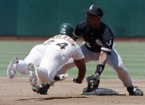 One of my favorite images in Baseball history is Rickey Henderson stealing bases head first. Here we have Rickey in mid flight against the White Sox on his way to stealing one of 1,406 career stolen bases. Thinking about it, I do not remember Rickey ever stealing feet first. If I remember correctly, in his autobiography “Off Base: Confessions of a Thief” he mentions he injured himself stealing feet first at a young age and decided never to do it again. Rickey ruled.