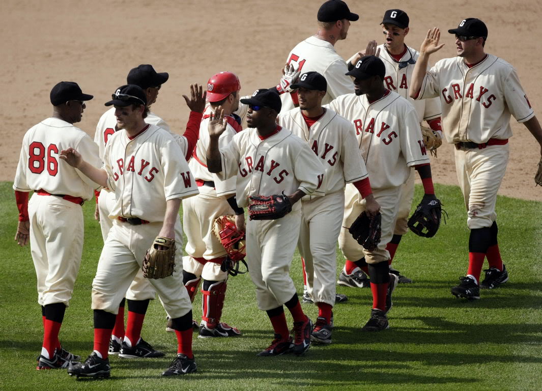 May 3rd, 2008. The Washington Nationals donned Homestead Grays uniforms in a game against the Pittsburgh Pirates. During the game, the Washington PA announcer referred to the Nationals as the Grays during the entire game which is incredibly awesome. The Nationals, or umm I MEAN Grays beat the Pirates 9-8 that day. It must have been the uniforms. Just look at those things, how can anytime lose a game wearing such cool uniforms??
