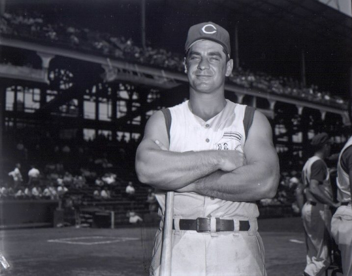 Ted Kluszewski in his trademark sleeve-less uniform. I found this cool story about Kluszewski on his wiki page, in which it is explained why he began to wear his jersey with no sleeves as young player with the Reds: