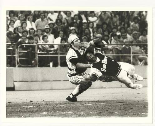 1979. Ozzie Smith of the San Diego Padres attempts to literally fly past Pittsburgh Pirates Catcher Ed Ott on his way to home plate.