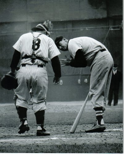 A pretty cool photo of Yogi Berra and Ted Williams during an at-bat. I just watched a DVD called “Yogi Berra: American Sports Legend” that I rented on Netflix. It is a pretty cool documentary that came out in 2004 that Bob Costas hosted which takes a look into Yogi’s life both past and present. Yogi’s good friend Ted Williams was interviewed in it which is great. One of the coolest parts of the film was Yogi playing wiffle ball with his family members in someone’s front yard. I thought this was pretty cool because at the time the film was made Yogi was in his late 70’s and his swing which I have become familiar with via watching movies of him my whole life is still physically there. I love Yogi Berra.