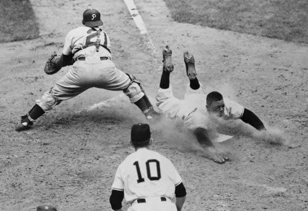 1951. Willie Mays slides safely past the Philadelphia Phillies’s Catcher Smoky Burgess. I love how Willie’s legs are bent at 90 degree angles in the photo.