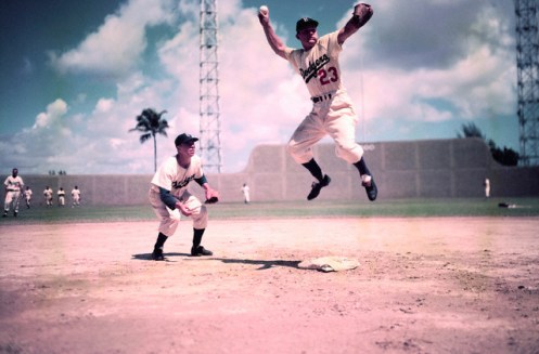 Pee Wee Reese and Don Zimmer of the Brooklyn Dodgers practice infield drills during Spring Training in 1955. Ole’ Popeye, or “The Gerbil” as Bill Lee calls him is now 80 years old and a coach for the Tampa Bay Rays. He is currently the last remaining former Brooklyn Dodger with on-field responsibilities in Major League Baseball.