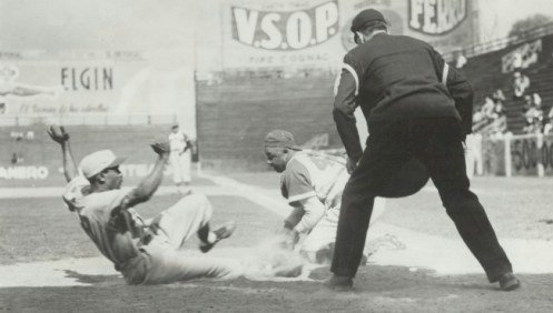 A great photo of Ted “Double Duty” Radcliffe blocking the plate as a base runner attempts to score. Something that caught my eye in this photo is that the Umpire is white and I assume this is a Negro League game? I’d like to think that I am pretty knowledgeable of the Negro Leagues and while I know that many of the Umpires in the Negro Leagues were retired players themselves; I am just not sure if their were White Umpires in the league? I guess the answer to this would have to be yes there were due to this photo unless this is a photo of Barnstorming teams playing each other?