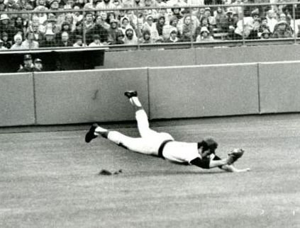 A great photo of Fred Lynn in 1975 making an incredible catch as he so often did during his time as the Center fielder for the Red Sox. During his his 7 year tenure in Boston he was voted to the All-Star game 6 times and won 4 Gold Gloves. Oh yeah, in 1975 he won both the AL MVP & Rookie of the Year becoming the first person in Major League history to do so. Fred Lynn was awesome.