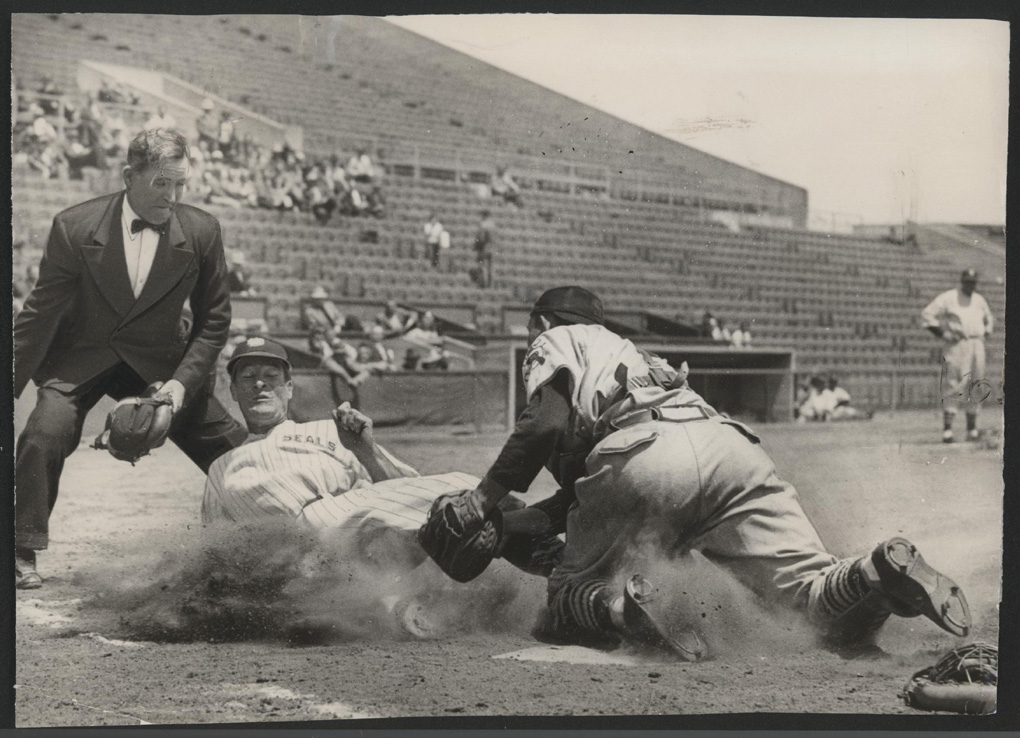 July 30th, 1943. Gus Suhr of the San Francisco Seals sliding into home as Eddie Malone of the Sacramento Solons tags him out. I recently found this photo and was delighted to say the least. Why you may ask? Well it’s because I knew who both of these PCL players actually were and the action shot is great.
