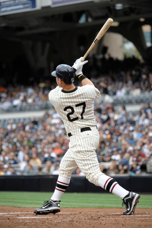 June 11th, 2011. Rookie First Basemen Anthony Rizzo of the San Diego Padres crushes his first career home run against the Washington Nationals. I couldn’t recall the last time I was so excited over a Baseball game after Rizzo hit the solo shot to right field. Everything is perfect about this photo: The 1936 Padres throwback uniform, the high socks, the sweet left handed home run swing. So awesome.