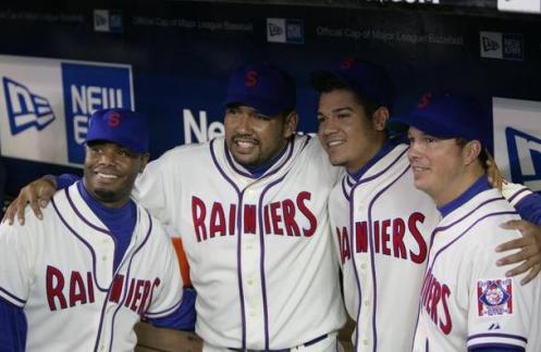 May 2nd, 2009. The Seattle Mariners and Oakland Athletics wore throwback uniforms honoring their PCL ancestors. Seattle repped the 1939 Rainiers and Athletics repped 1939 Oaks. The always amazing Ebbets Field Flannels supplied the incredible uniforms and did a great job. I think it’s pretty apparent that Ken Griffey Jr, Carlos Silva, Felix Hernandez, and Erik Bedard all enjoyed wearing these awesome uniforms that day. To check Oakland’s uniform that day, HERE is a great photo of Trevor Cahill.