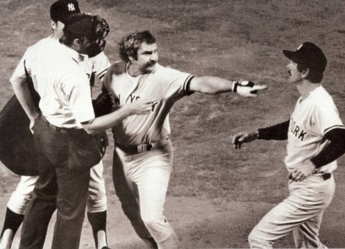 Yankees Captain Thurman Munson and Skipper Billy Martin engage in a confrontation with an Umpire in 1979. I absolutely love everything about this photo and would love to hear the back story on what exactly went down. Thurman pointing at Billy to get back in the dugout to avoid being tossed (I assume) is absolutely priceless.