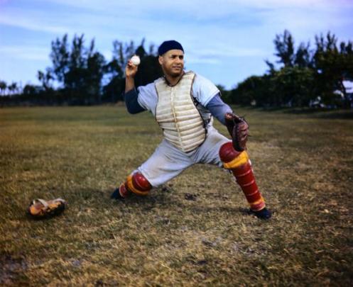 Josh Gibson & Ted “Double Duty” Radcliffe: Two of my favorite Negro League stars just happen to be Catchers and this awesome photo from one of the East-West All-Star games in the early 1940’s in Comiskey Park captures both of them in action. Radcliffe’s “Double Duty” nickname was no joke as during his career he had more than 4000 career hits and hit over 400 home runs while batting. While pitching he won close to 500 games and struck out over 4000 batters. This was all while playing for over 30 Negro League, Barnstorming and Independent League teams during his 36 year career in the game. His autobiography, “Ted ‘Double Duty’ Radcliffe: 36 years of Pitching & Catching in Baseball’s Negro Leaguesis great and I suggest every Baseball fan read it.