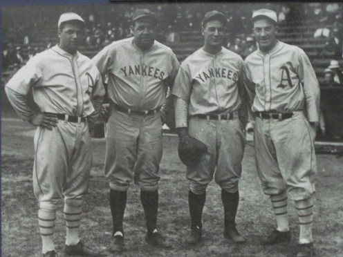 Jimmie Foxx, Babe Ruth, Lou Gehrig, and Mickey Cochrane all pose for a photo together. Not too much to say about this photo with the exception that there is a whole lot of Baseball talent combined in this group photo. Also, how about them awesome stirrups that Foxx & Cochrane have on!?