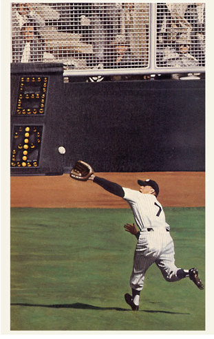 Game 5 of the 1956 World Series. This photo captures Mickey Mantle saving Don Larson’s perfect game by making a great running catch in the 5th inning . The ball was hit in deep left center by Gil Hodges and Mantle made the catch in a full sprint. What an incredible photo I must say. Everything that Mantle did looked at least x10 cooler than anyone else doing the same.