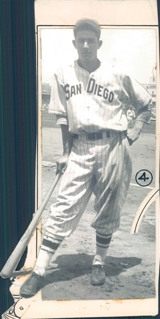 Vince DiMaggio during his time with the inaugural 1936 San Diego Padres of the Pacific Coast League. Besides the well known and easy to find team photo of the 1936 Padres, I had never seen a photo of Vince in the Padres pinstripes. Needless to say, I was very delighted to discover this photo.