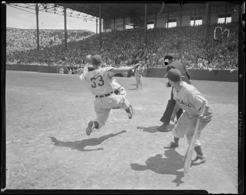 June 17th, 1948. Such an INCREDIBLE photo. Gene Macuh of the Chicago Cubs is caught on camera in mid-air attempting to score against Boston Braves catcher Bill Salkeld.