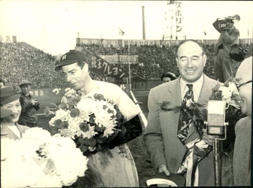 1951, Tokyo Japan. Joe DiMaggio and Lefty O’Doul are honored during a visit to Japan as ambassadors of the game just 6 years after World War II officially ended. Look at all the people in the stands, pretty impressive turnout I must say.