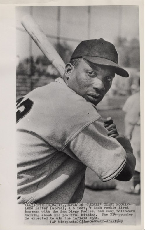 A 1949 AP photo of Luke Easter during first season with the San Diego Padres of the Pacific Coast League. Not only was this Easter’s first season in the PCL, it was also his first year in desegregated baseball as he spent the prior 2 seasons with the Homestead Grays of the Negro Leagues.