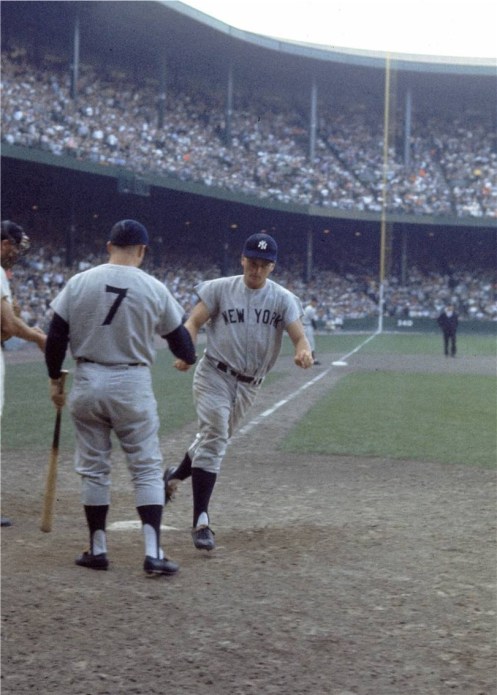 It doesn’t get much better than this: A 1961 color photo of Roger Maris being greeted at home-plate by Mickey Mantle after hitting one of his record breaking 61 homeruns.