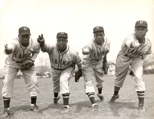 The Pitching staff for the 1946 Oakland Larks of the short-lived West Coast Baseball Association (also known as the West Coast Negro Baseball Association): Wade James, Wee Willie Jones, Charles Speck Roberts, Marion Sugar Cain.