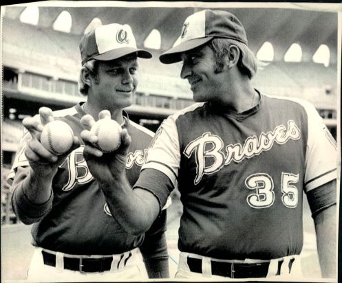 Brothers Joe & Phil Niekro during their time together with the Braves. The famous pair of knuckleballers played together in Atlanta in both 1973 and 1974 and hold the record for the most wins by a pair of brothers with a combined 539. Jim & Gaylord Perry come in at a close second place with 529 combined wins.