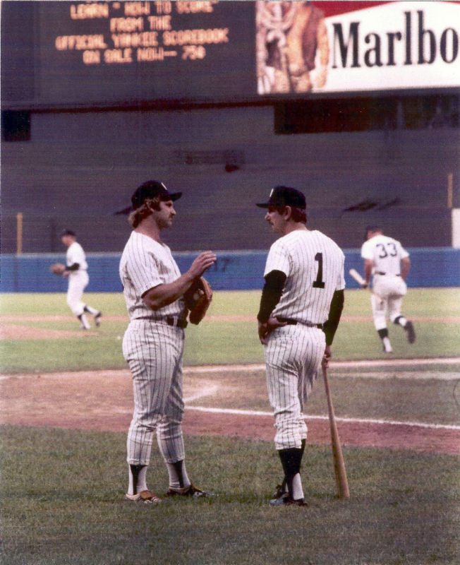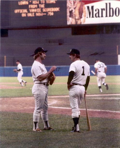 Thurman Munson and Billy Martin. Something about this photo of these two tragic figures is absolutely perfect to me. The moody Yankees Captain conversing with the Yankee skipper who potentially wore the pinstripes with more pride than anyone else in Baseball history. I love it.