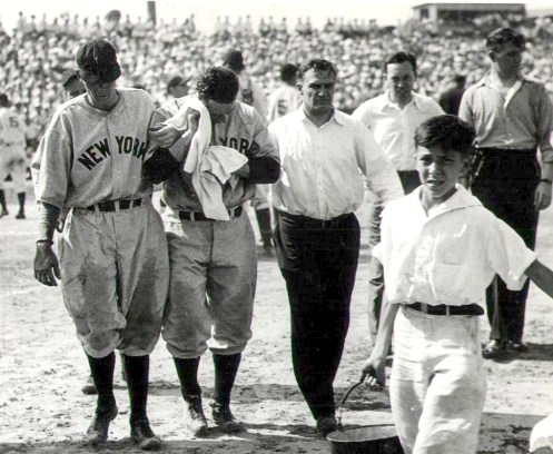 Gehrig being assisted off the field after being hit in the head while at bat. The fact that MLB teams did not start to implement batting helmets until the early 1940’s and officially made them mandatory in the mid 1950’s still kind of blows my mind. Ray Chapman was killed in 1920, so that’s literally decades of playing Baseball in the big leagues without another death. All I can say to that is players back then were incredibly lucky another tragedy on that level never happened again.