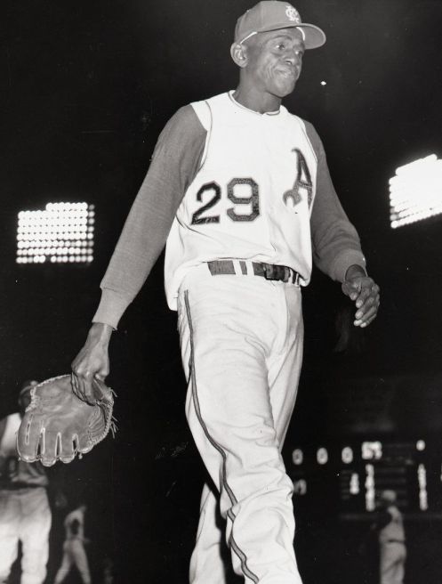 September 25th, 1965. Satchel Paige leaves the field at old Municipal Stadium in Kansas City after his last pitching appearance in the Major Leagues. The 59 year old Paige pitched 3 scoreless innings against the Red Sox as a member of the Kansas City Athletics. I would kill for an entire video of this entire pitching performance.