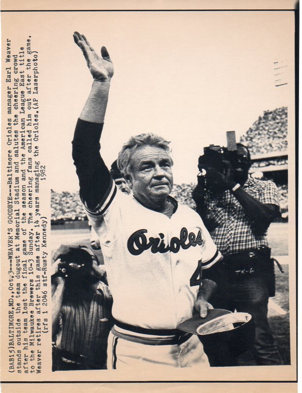 Weaver says goodbye to Orioles fans after managing his last game before retiring after the 1982 season. He later returned to manage the Orioles for the 1985 and 1986 seasons.