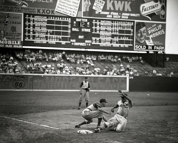 Another great photo of Musial at Sportsman’s Park in St. Louis as he slides safely into third base. Much like the photo of Musial fielding a ball a few photos up, I love footage of sluggers from the Golden Age of Baseball on the base paths for the same reason.