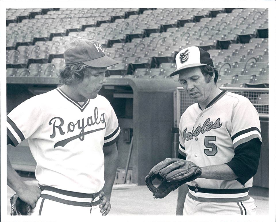 Hall of Fame third basemen George Brett and Brooks Robinson talking shop. With Brett obviously being early in his career and Robinson’s career winding down, this photo makes me wonder if Robinson took him under his wing and passed down any potential knowledge?