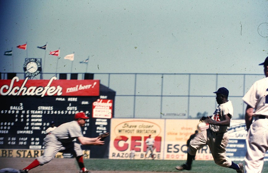 A great action shot of Jackie Robinson attempting to get back to third base during a game at Ebbets Field. This is an amazing photo with a much different perspective than I’m used to seeing. The fact that color photos from this era in Jackie’s career exist make me incredibly happy.
