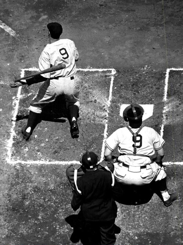 1936. Joe DiMaggio connects for a hit during his rookie season as a member of the Yankees. While I knew that DiMaggio didn’t wear #5 during his rookie season, it didn’t occur to me that he wore #9 until I came across this photo.