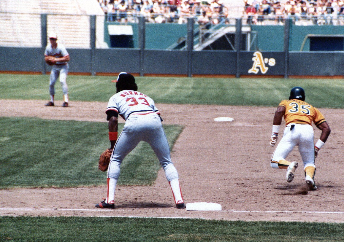 A great action shot of Rickey Henderson taking off for second base against the Baltimore Orioles while Eddie Murray unsuccessfully attempts to hold him on. I dig this photo like crazy as it captures great uniforms from the late 70s/early 80s, two future Hall of Fame members and the Oakland Coliseum during it’s glory years.