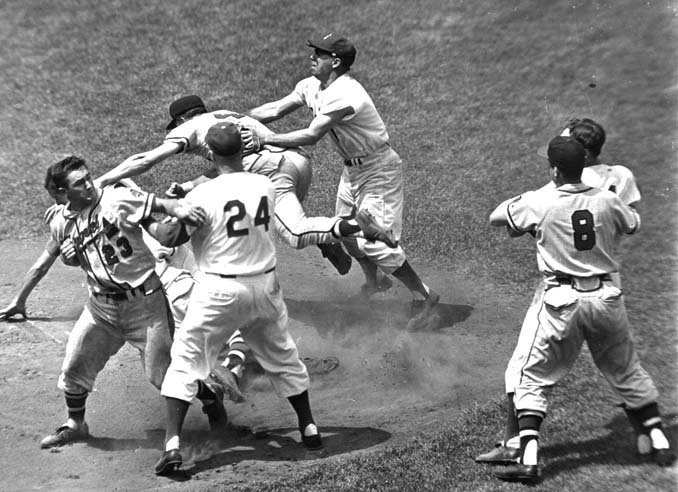 -Rear: Pee Wee Reese attempting to pull Eddie Mathews off Drysdale.